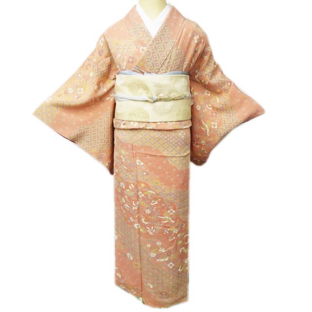 > 訪問着 着物 中古 袷 フォーマル 道長取り 七宝 花唐草 宝物 鶴 青海波 柔らかい赤系色 多色 身丈157cm 裄65cm M きもの北條 A859-4
