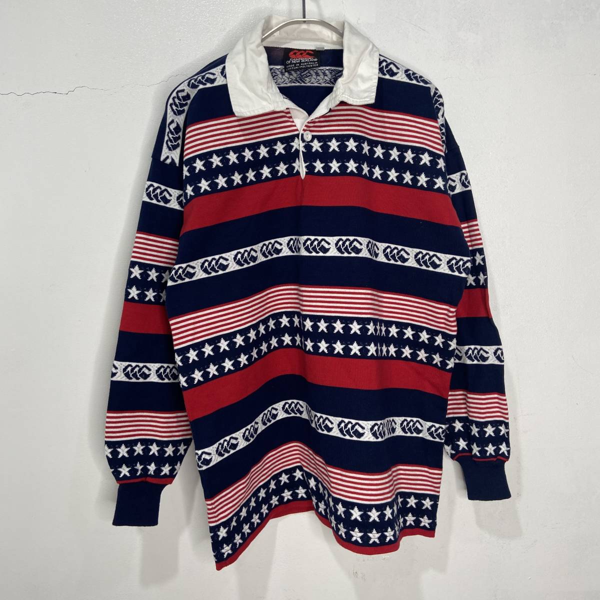 > ☆送料無料☆CANTERBURY OF NEW ZEALAND☆カンタベリー☆アメリカ星条旗ボーダー柄ラガーシャツ☆長袖ポロシャツ☆総柄☆M☆E23