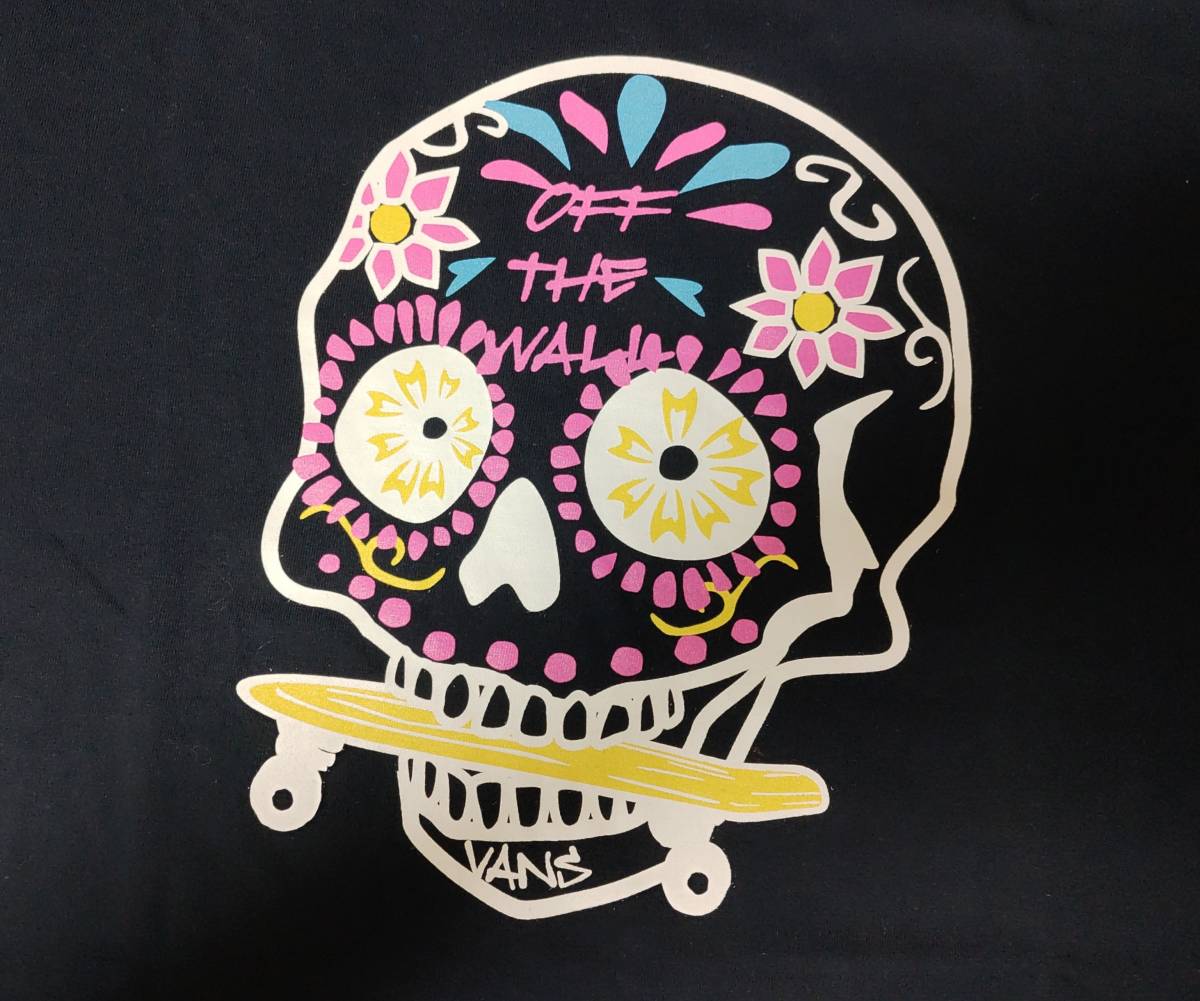 - 2016 インパクト タワレコ×VANS『MEX SKULL』Tシャツ 丸首 半袖 NAVY 前後プリント 左袖パッチ L・身幅約52.6cm※未試着/未使用/タグ付き