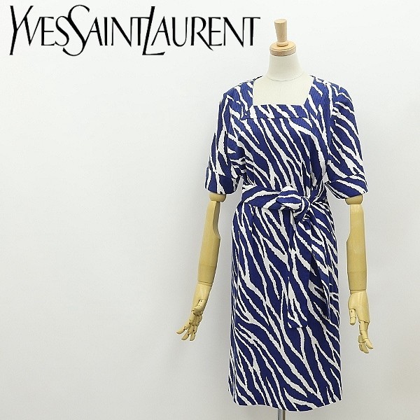 > ヴィンテージ◆Yves Saint Laurent イヴサンローラン 総柄 スクエアネック リボンベルト付 ワンピース ネイビー×ホワイト M