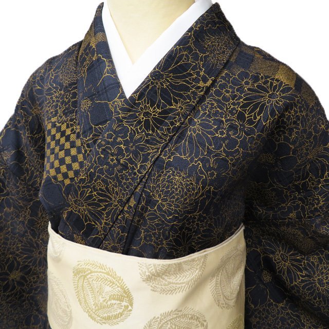 > 小紋 着物 中古 リサイクル 正絹 袷 カジュアル 花模様 市松模様 黒色 金 身丈161cm 裄66.5cm M きもの北條 A883-8