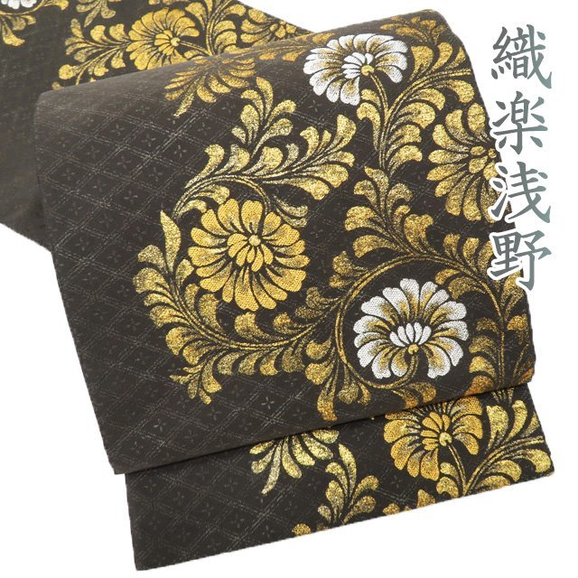 - 特選 袋帯 中古 リサイクル フォーマル 仕立て上がり 六通 西陣織 織楽浅野 地模様 植物文様 宝相唐草 黒鳶色 金銀 きもの北條 A899-15