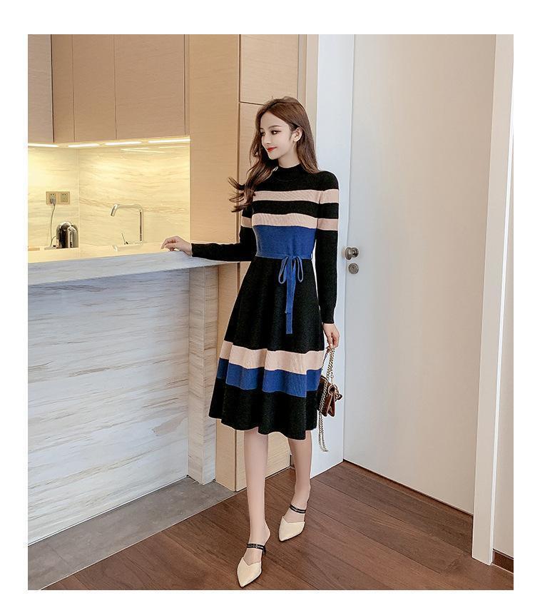 - 【ブラック】3色 ストライプボーダーウエストリボン長袖 ニット韓国