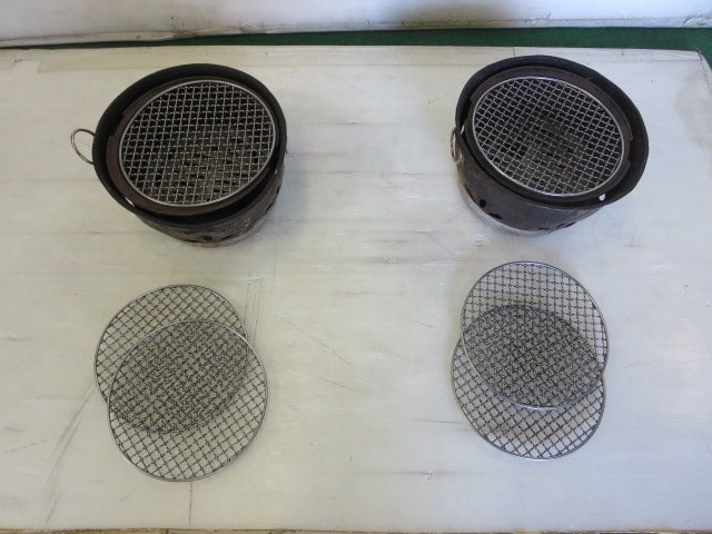 USE(ユーズド) 炭火焼きコンロ 2台です。 アウトドア、家庭でも簡単に本格的な炭火焼きを楽しめます。 火のついた炭を入れ、その上に焼き網と食材をのせたらおいしい料理が楽しめます。 コンロのサイズに比べて焼き網のサイズが小さいので、網の反転に注意して下さい。(大きな網をご用意下さい) 全体サイズ:幅30×奥行30×高さ18cm (直径30cm) 5.5kg 焼き網は3枚/1台です。 1台のゴトクの底面が破損しています。このままでお願いします。 変色、変形、汚れあります。 サイズ:幅30cm 奥行30cm 高さ18cm 重量5.5kg