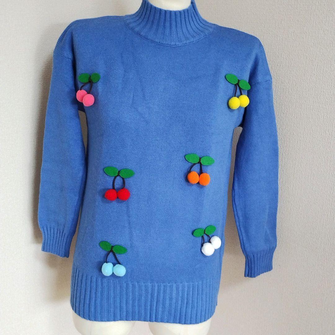 - 【ブルー★XLサイズ】サクランボ ぽんぽんモチーフ 丸首セーター パフスリーブ