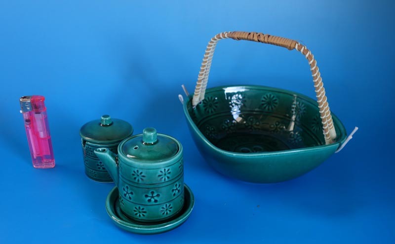 - 京焼 清光焼 緑交趾 漬物鉢揃 漬物鉢 天塩皿 薬味入 醤油差 平安 漬物鉢セット 角鉢ツル付