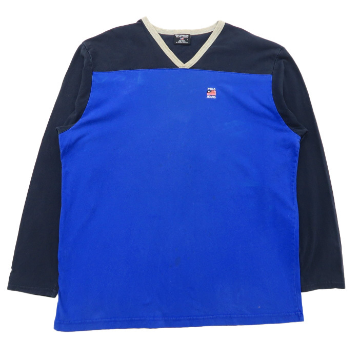 - 古着 USA製 ラルフローレン POLO JEANS CO. ロングスリーブTシャツ 長袖 Vネック ワンポイント ブルー ブラック サイズ表記:L gd43464