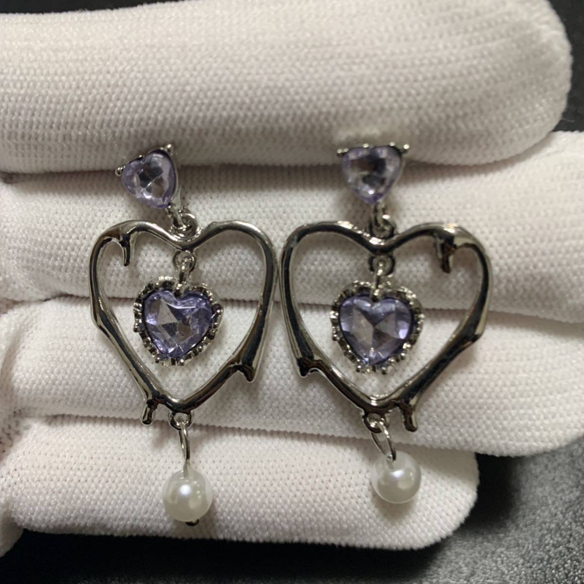 - 地雷系 とろけるハート パープルストーン フェイクパール付き ピアス シルバー