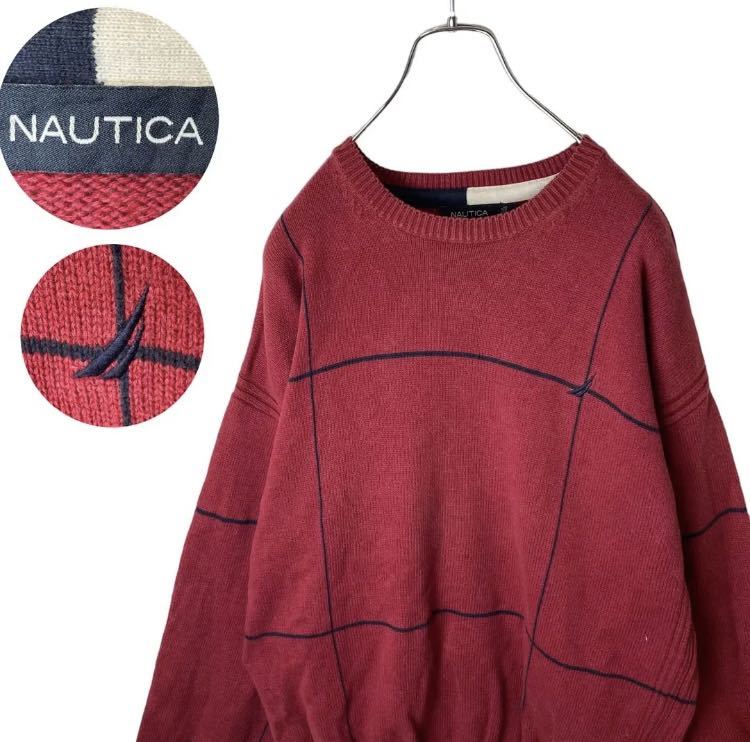 - グッドデザイン古着!NAUTICAノーティカ刺繍ロゴコットンニットボルドーXL