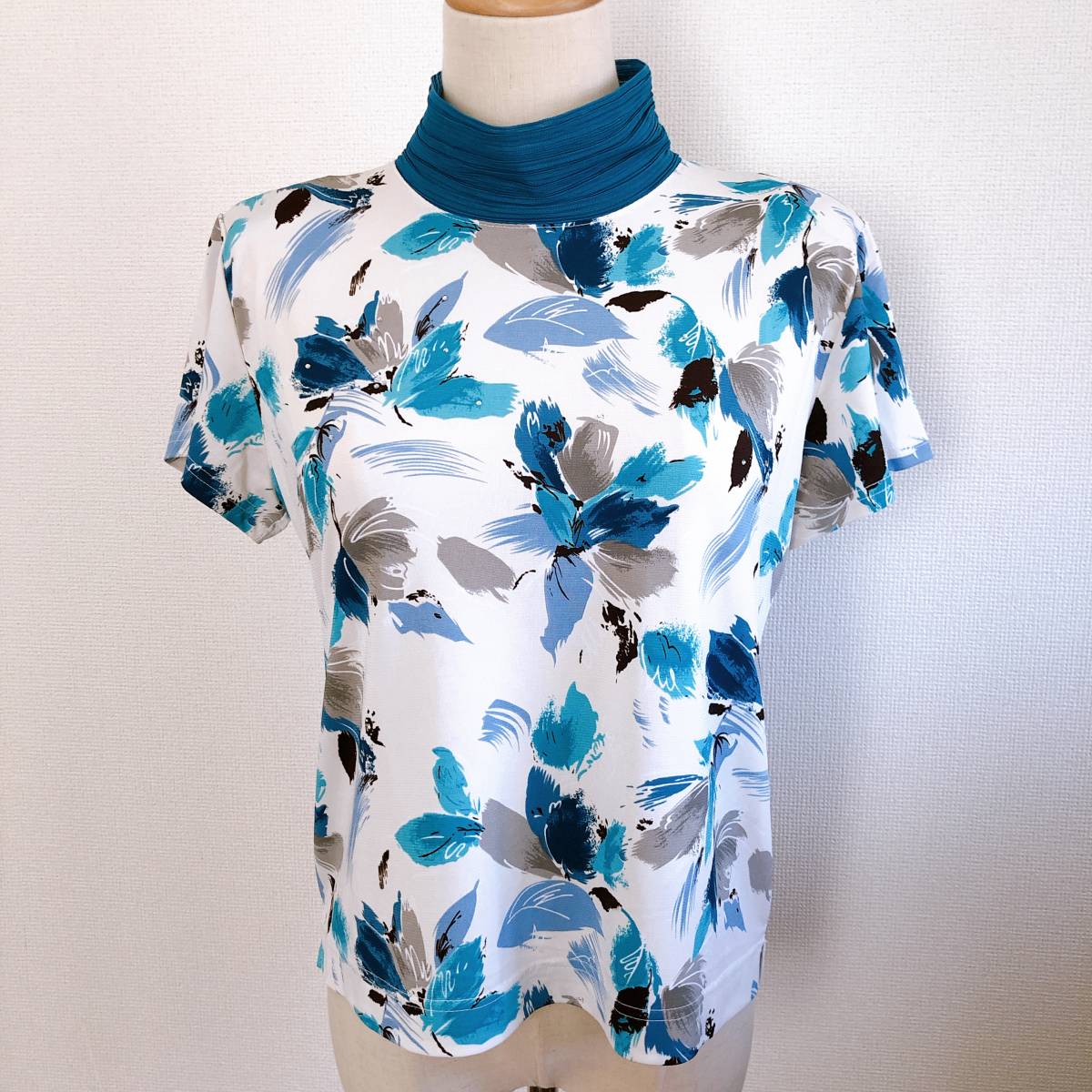 > WS0291 美品 PLUS ONE プラスワン レディース ブラウス 半袖 M〜L ブルー系 花柄 肩パット 昭和レトロ エレガント キラキラビジュー