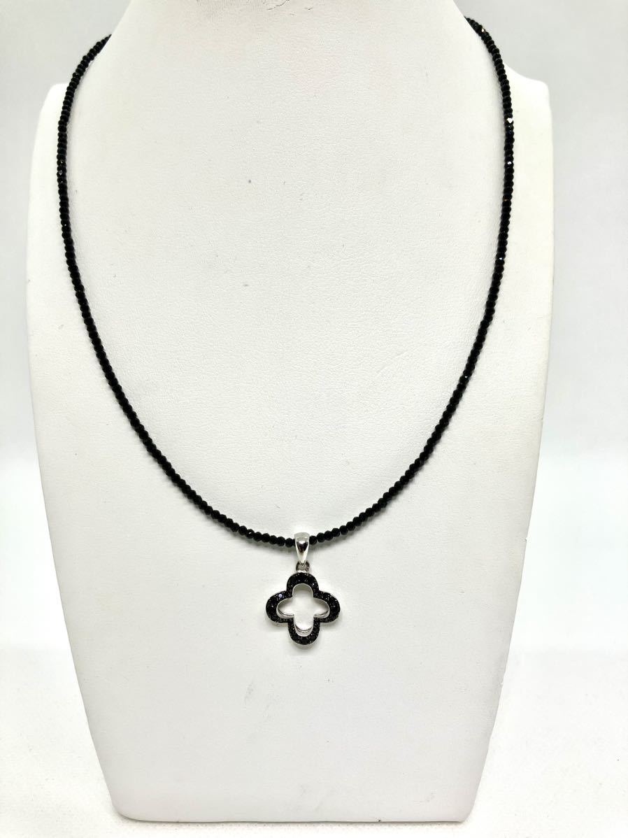 > 【新品】ブラックスピネルネックレス*四つ葉クローバー*デザインネックレス*天然石*縁起*8月の誕生石*パワーストーン
