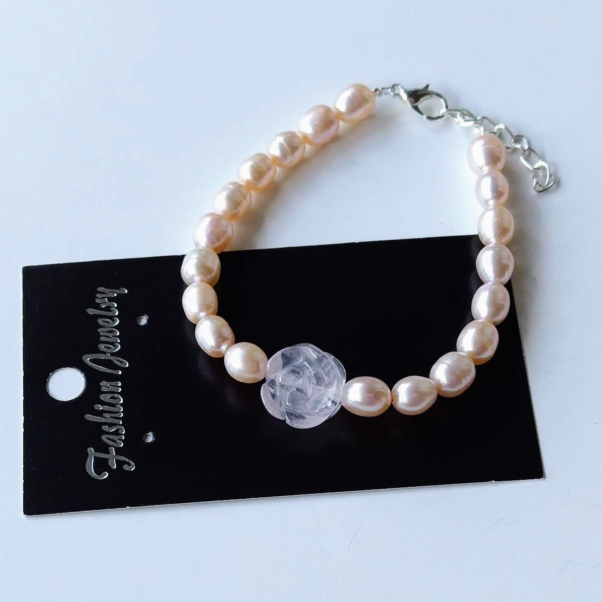 - 天然石ブレスレット(淡水真珠、ローズクォーツ薔薇)