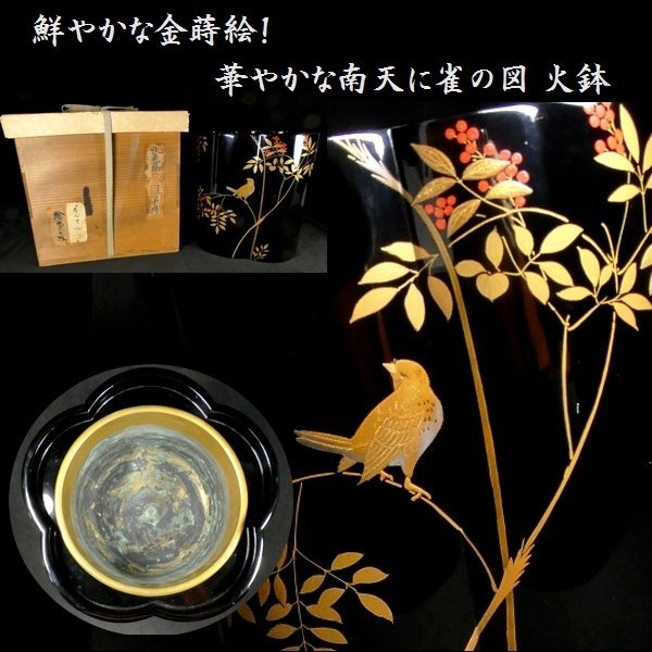 【 恵 #0915 】 鮮やかな金蒔絵! 華やかな南天に雀の図 木製 火鉢 保管箱あり 漆芸品拍卖