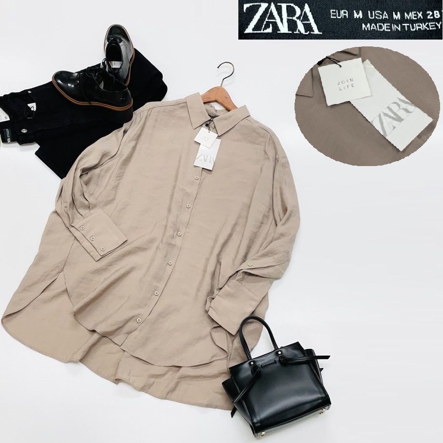> /M/ ZARA ベージュ オーバーサイズ長袖カラーシャツ レディース タグ カジュアル トップス フェミニン 大人可愛い デイリー ザラ