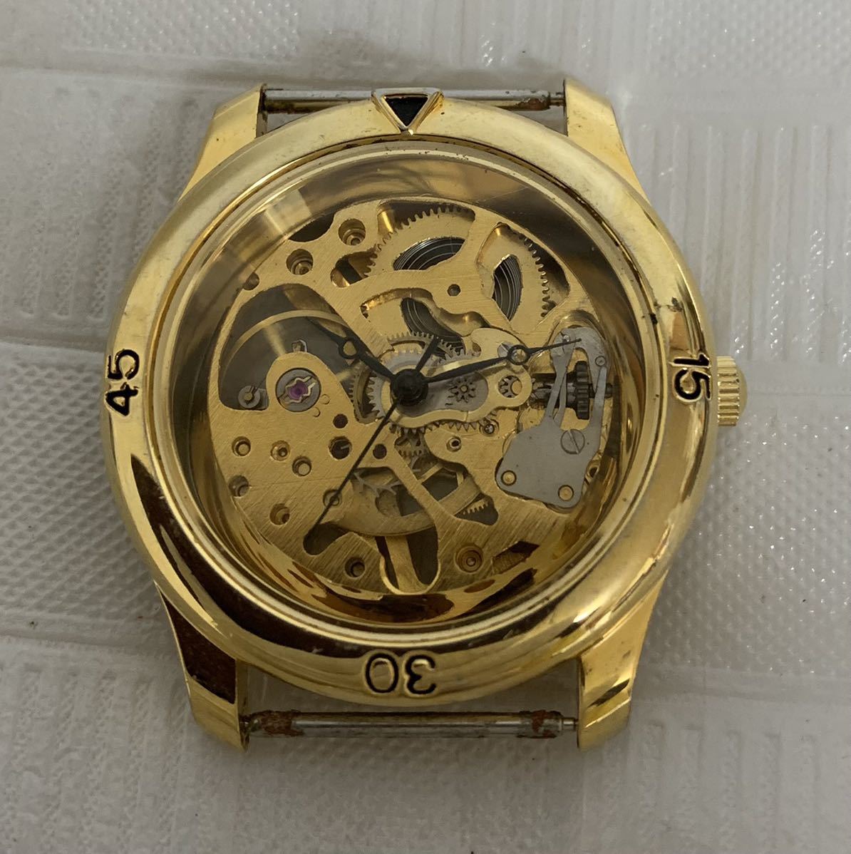 - スケルトン ウォッチ/フェイスのみ/動作不動/部品取り用/ゴールド系/手巻き/風防小傷削れ溝など汚れ/金属削れ欠損サビ等経年/ジャンク