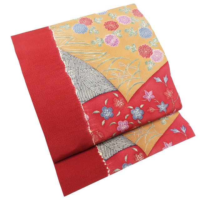 > 特選 多ち花 名古屋帯 なごや帯 中古 リサイクル 正絹 カジュアル 仕立て上がり 花模様 赤色 土器色 多色 きもの北條 A969-7