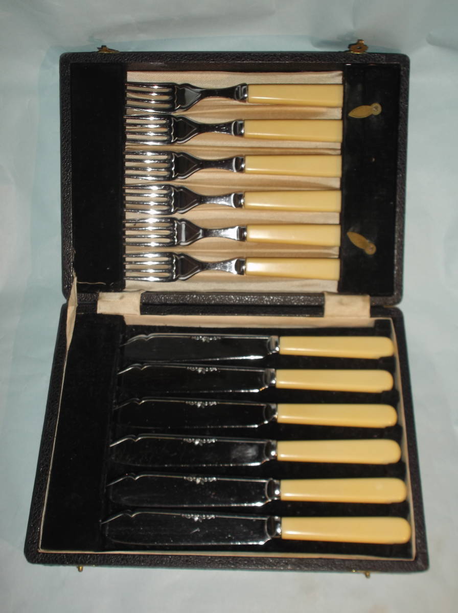 - 英国ビンテージ ナイフ&フォーク セット カトラリー ケース付 シルバー色 アイボリー色 クロム クローム プレート CHROME NS
