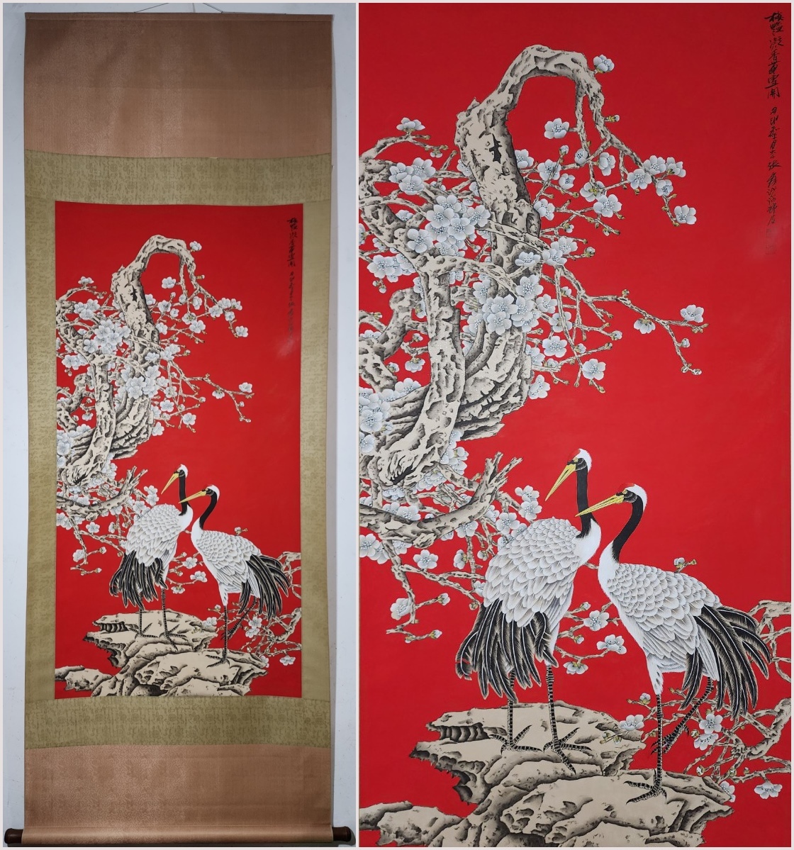 - 古美術 掛け軸 中国・近現代 張大千書 「梅花双鶴図」 紙本 立軸 書道 巻き物 真筆逸品 肉筆保証 唐物 古画 LT-24106