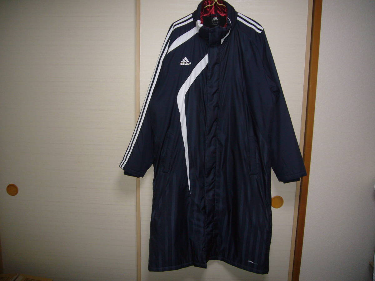 - アディダス シャドーストライプ ロングコート紺×白Oサイズ 難あり