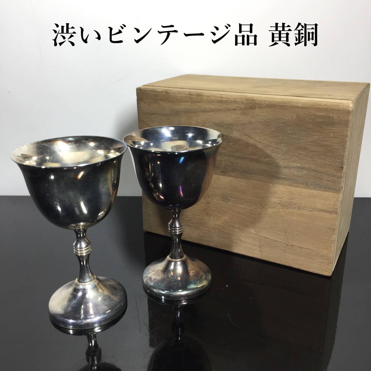 - 黄銅製 黄銅刻印有り グラス ワイングラス 置物 オブジェクト 金属工芸 ペア ビンテージ 古品 虹色のような複雑玄妙な色 非常に渋い味わい
