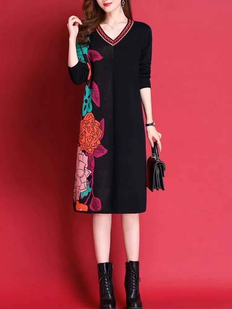 - 【ブラック花柄色★L】長袖 V ネック ひざ丈 ニットワンピースおしゃれ