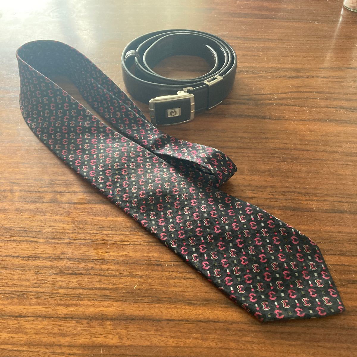 - ミラショーン ネクタイ シルク100% 黒ピンク、レザーベルト 濃い茶色 イタリア製 レトロ