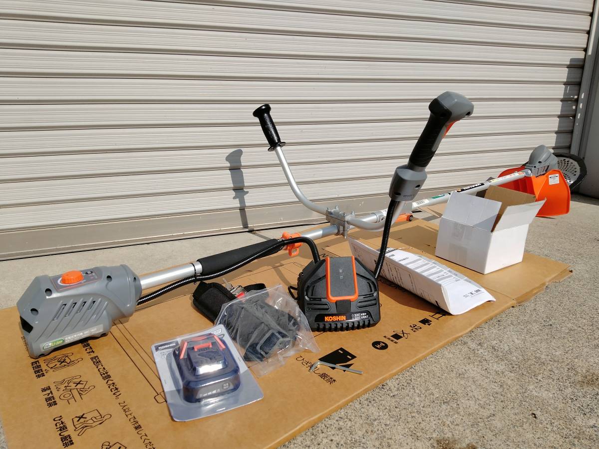 > 【新品未使用】 工進 18v バッテリー 電動 刈払機 草刈機 Uハンドル バッテリー充電器 新品 軽い 肩掛け 女性向け