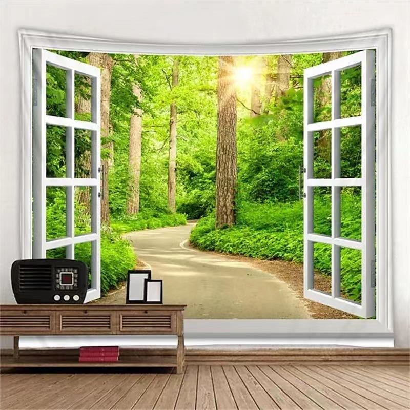 - タペストリーB29 金具付き 窓 景色 ウォールデコ 緑 オアシス 陽の光