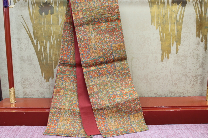 > きもの今昔6448 袋帯 正絹染帯 煉瓦色更紗柄 両端の口綴じはしていません未仕立て品 帯の長さ420cm