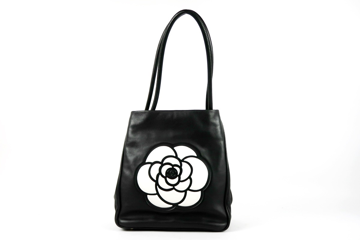 > 【美品】CHANEL シャネル ラムスキン カメリア CHANELロゴ トートバッグ ブラック【OO52】