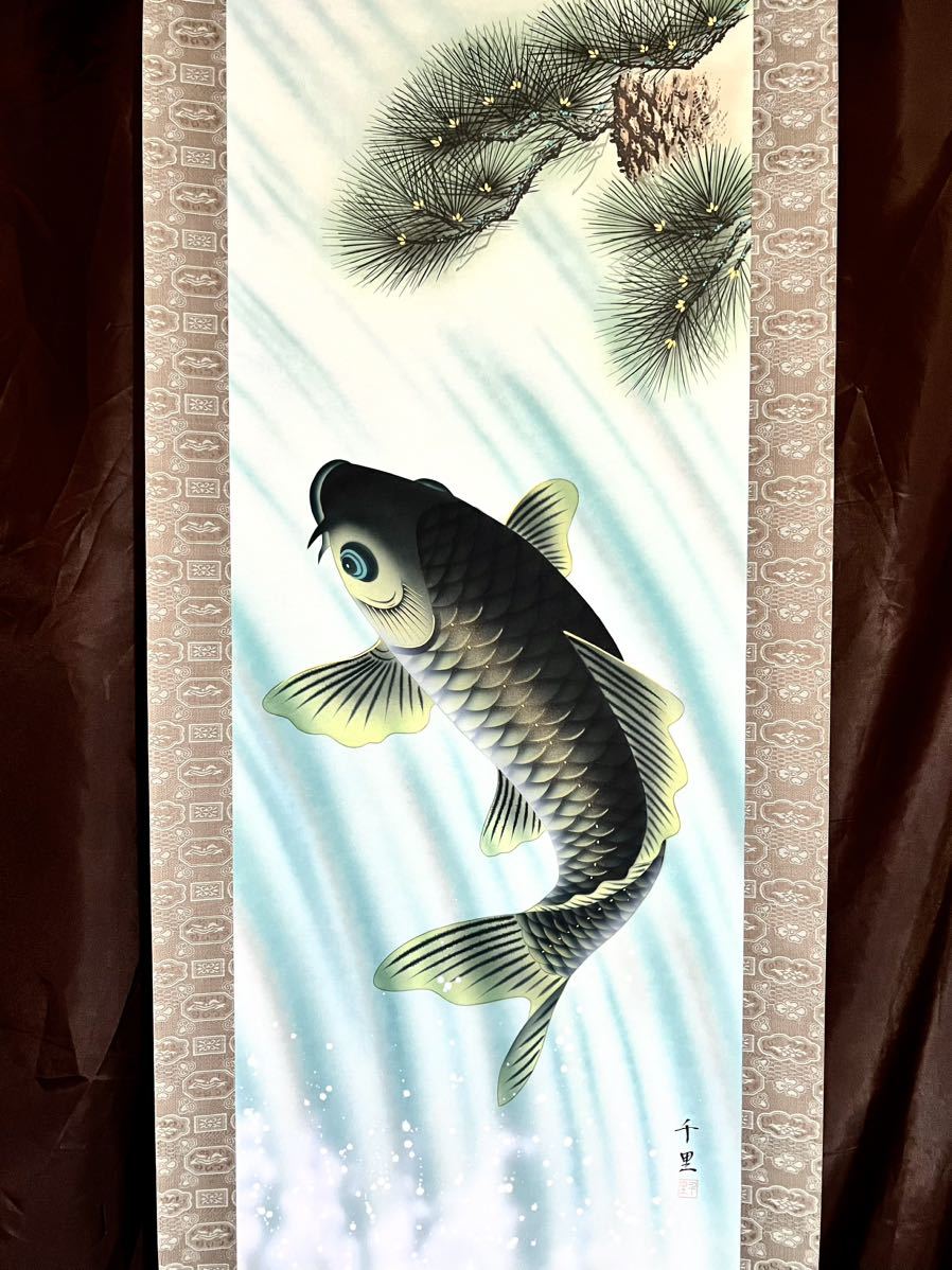 - [真作] [S8] 千里「飛鯉図」絹本 肉筆 金泥 鳥獣 魚図 登龍門 瀑布 日本画 絵画 掛軸