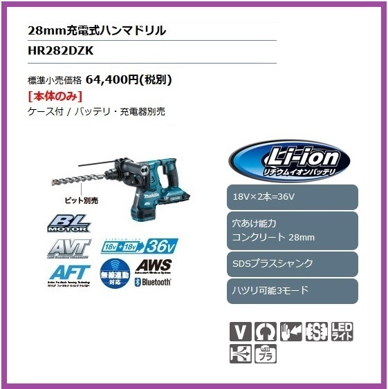 > マキタ 28mm 18V 充電式ハンマドリル HR282DZK [本体+ケース]【18V+18V→36V】 ■安心のマキタ純正/新品/未使用■