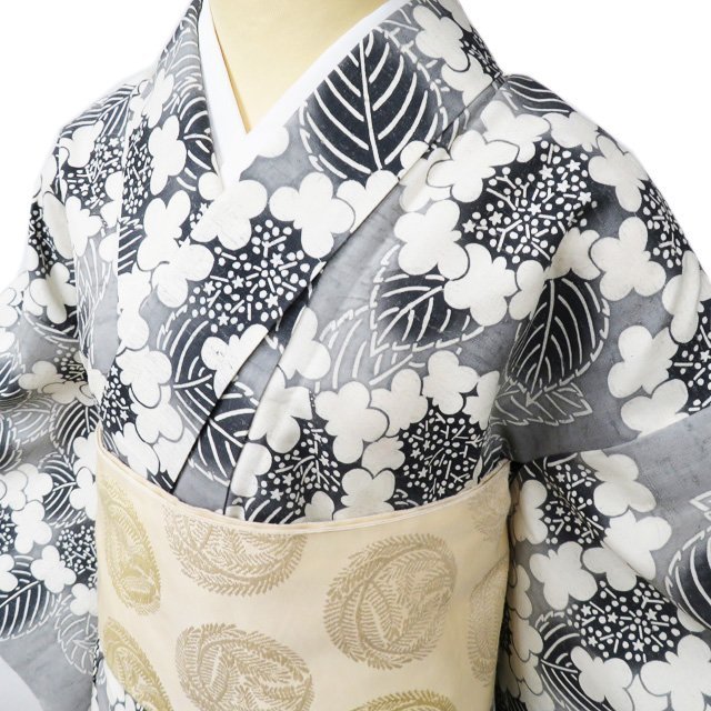 - 紬 着物 中古 正絹 単衣 カジュアル 花模様 あじさい 紫陽花 オフホワイト 灰色 身丈160.5cm 裄63cm M きもの北條 A985-5