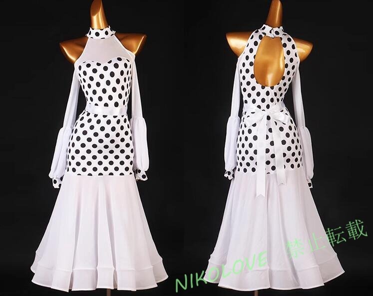 > 新品レディース社交ダンス衣装 お洒落トッド柄ロングワンピース ホワイト サイズS~XXL選択可 サイズ調整可能AA102