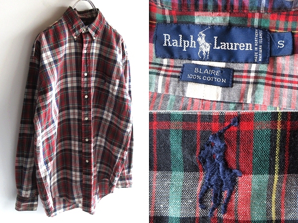 > 希少 90sビンテージ Ralph Lauren ラルフローレン BLAIRE ポロポニーロゴ刺繍 コットン チェック BDシャツ S レッド グリーン USA企画
