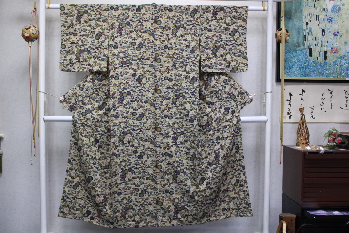 > きもの今昔6671 小紋のきもの 広衿袷手縫い仕立て 正絹一越地紅型調 野辺の草花母屋風景柄 サイズ小さめ身丈144cm