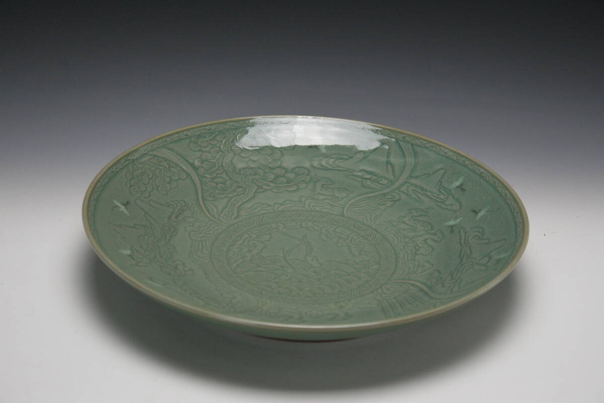 - 韓国 李朝 飾皿 流谷 作 高麗青磁 縁唐草祥瑞陰刻十長生文大皿