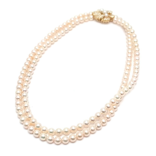 コメント | 優美な煌めきを放つアコヤ真珠(7.5mm~8.0mm)が2重に連なるミキモト(MIKIMOTO)のパールネックレスです。パール、ダイヤモンド(計2.03ct)で模られたフラワーモチーフ、バックスタイルにまで拘りを魅せる豪華なクラスプでフロントをラグジュアリーに彩るのもオススメです。ボリューム感がありながらも、気品ある華やかな胸元を演出してくれます。 パールには特有のエクボがございます。1個のパール表面に荒れが見られますが(拡大画像参照)、着用時には肉眼では気にならないかと思われます。 ダイヤモンドクラスプ 横32.4mmx縦27.7mm 総重量100.3g 緑屋商品番号:5008739 | 程度 | 中古Aランク | 素材・色 | K18YG | サイズ | ネックレス51cm | 付属品 | ギャランティーカードなし 箱あり |