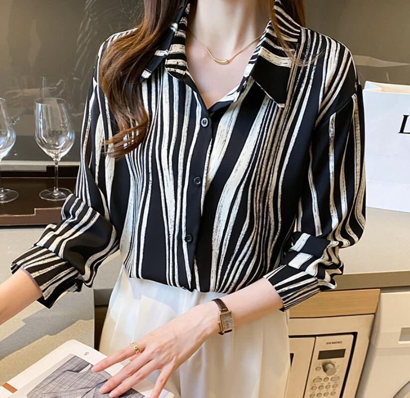 - 春新作 エレガント シフォン ブラウス ボーダー柄 長袖 ブラウス 30代 40代 50代 通勤 OL カジュアル オシャレ トップス / ブラック