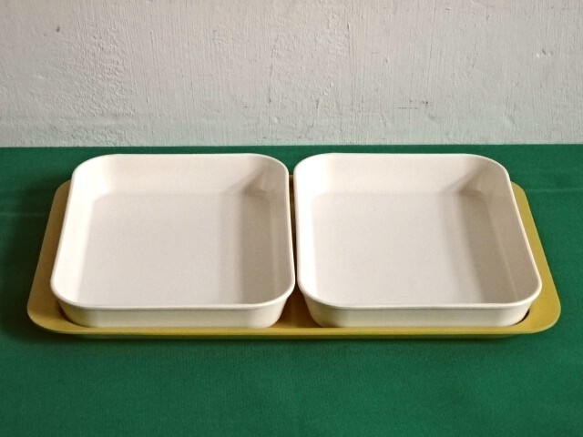 - ●○東ドイツ製 プラスチックトレー&プレートのセット 白×からし色○●DDRGDRレトロビンテージアンティークヴィンテージ KI169
