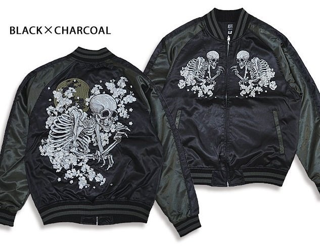 - がしゃ髑髏スカジャン◆朧 ブラック×チャコールXLサイズ 9023821 和柄 和風 おぼろ ドクロ 刺繍 スーベニアジャケット