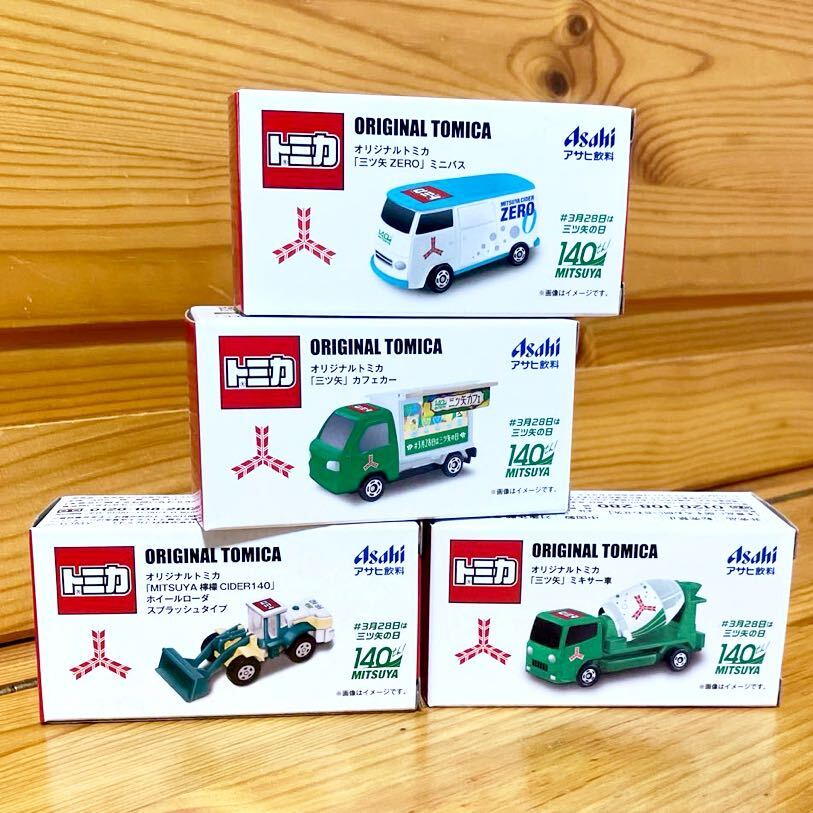 - k10)トミカ ミニカー Asahi 三ツ矢サイダー ホイールローダ スプラッシュ カフェカー ミニバス ミキサー車 オリジナル 4点セット
