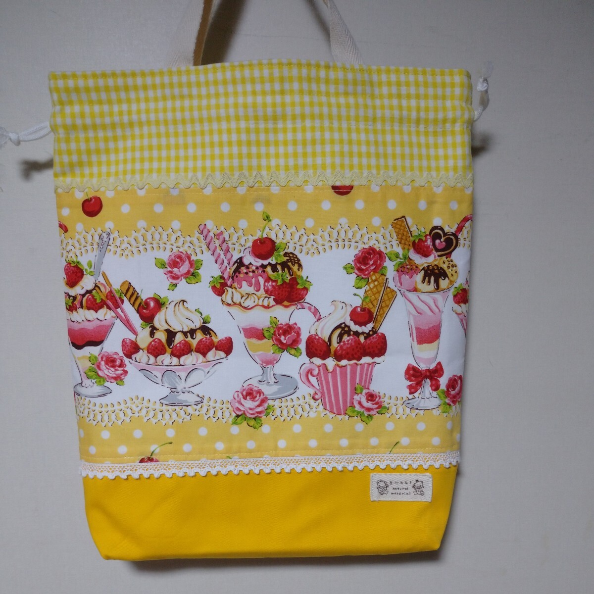 - ハンドメイド お着替え袋 トート 巾着袋 2way パフェ柄 黄色 ASHIATOYA タグ マチ付 即決