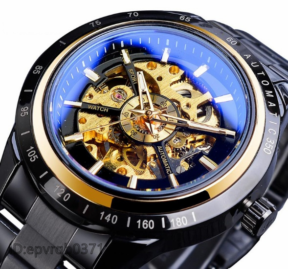 > 男性腕時計 新品 機械式自動巻 メンズ ウォッチ スケルトンデザイン 夜光表示 シンプル 紳士用 通勤 黒/ゴールド
