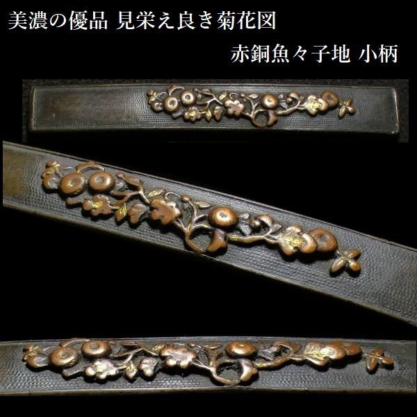 > 【 恵 #1088 】 美濃の優品 見栄え良き菊花図 赤銅魚々子地 小柄 検:鍔/縁頭/切羽/ハバキ/刀剣/刀装具