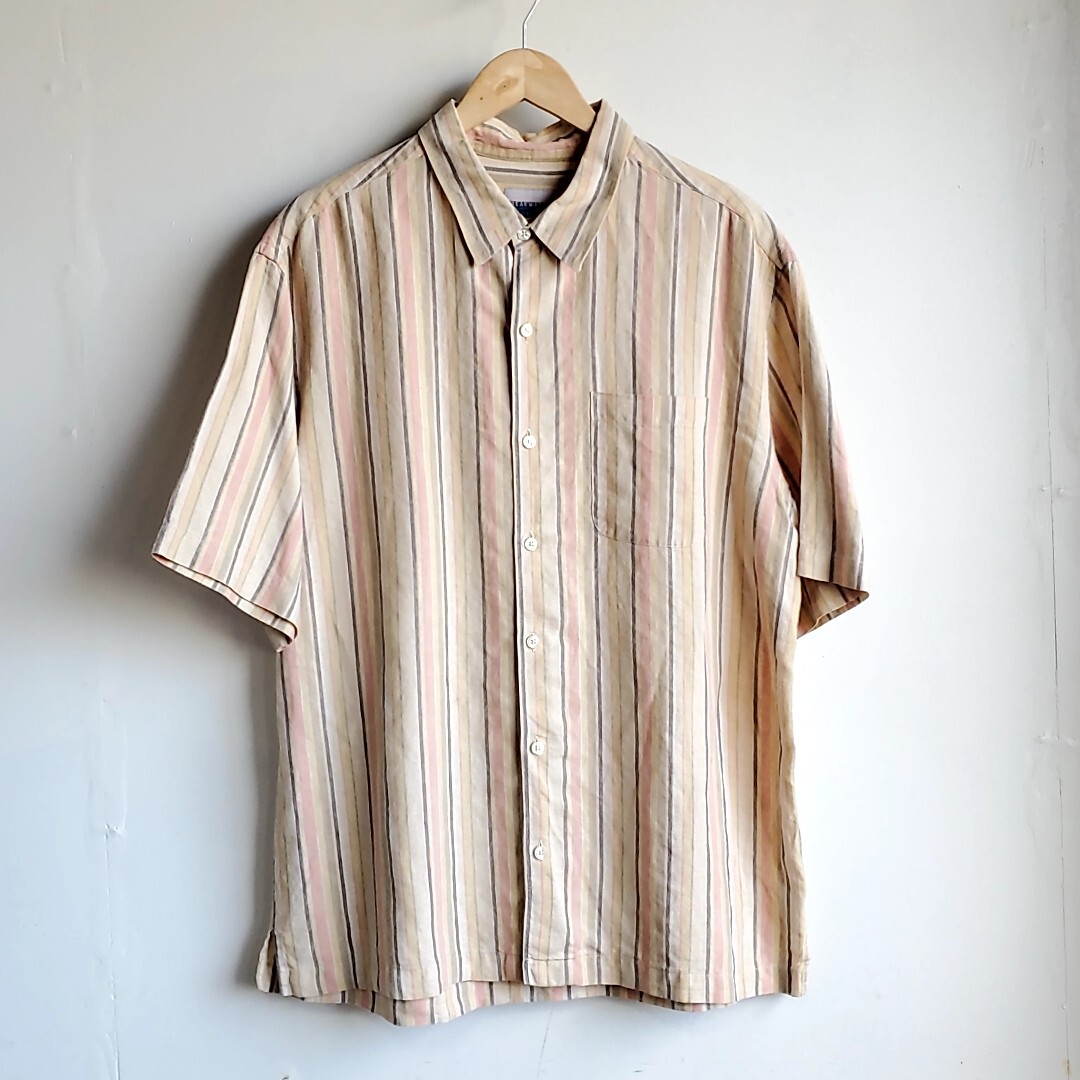 > 604◆BREAKWATER リネン 半袖シャツ sizeM ストライプ柄 シンプル 麻 中古 USED 古着