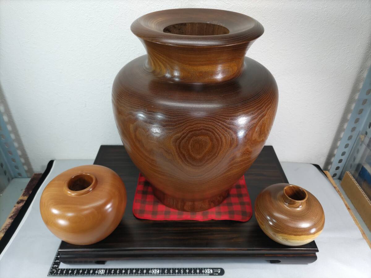 - ■送料無料!■まとめて■木製花瓶・H35×W28cm■木製■無垢■天然木■工芸品■切り株■エンジュ■3点セット!