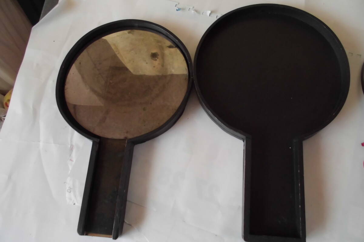 - 明治大正時代の金属手鏡裏面彫刻堀木製ケース入骨映ります 珍品