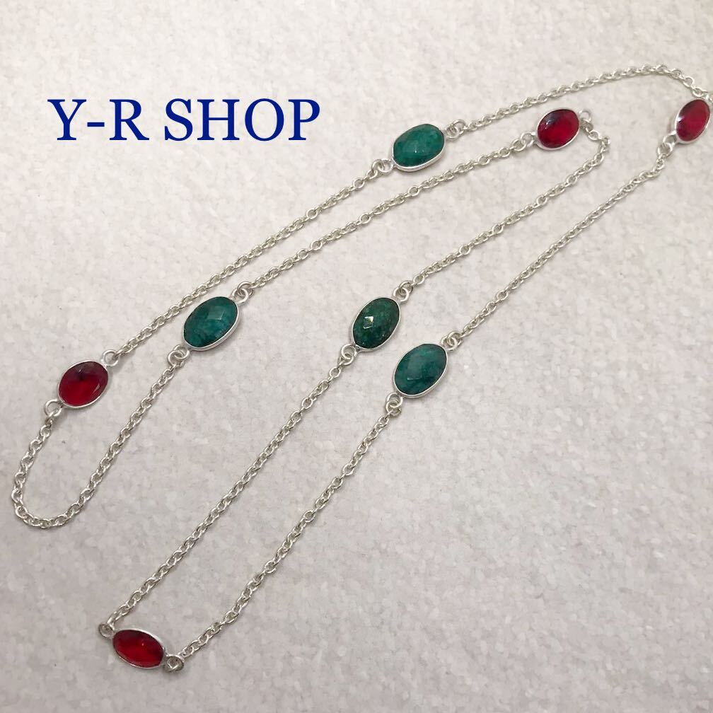 - 天然石★エメラルド とガーネットのロングネックレス★レディースペンダントカラーストーンアクセサリーシルバー新品宝石Y-RSHOPインド卸売