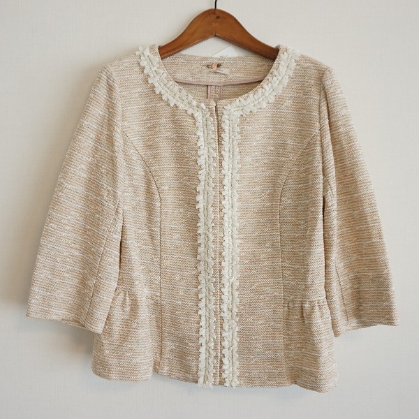 - #anc ローズティアラ Rose Tiara ジャケット 42 ベージュ系 ノーカラー 薄手 レース 七分袖 レディース [748578]